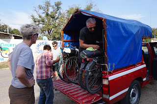 apareceu um táxi vazio! Coubemos todos, com as bicicletas e os alforges. Tudo