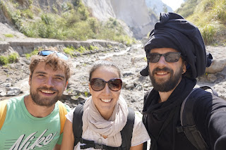 Eu, para além de necessitar de lidar com essa dificuldade, ainda precisei de por à prova a minha determinação perante as vertigens que estava a sentir. O caminho muito inclinado, estreito e com fortes inclinações nas laterais, provocou-me bastante ansiedade. No entanto, avançando bem devagarinho e usando as mãos e os pés para ir descendo fui percorrendo o caminho beneficiando da paciência do Joachim e do Jannik que iam esperando por mim no final dos pedaços mais difíceis e se ofereciam sempre para me ajudar.